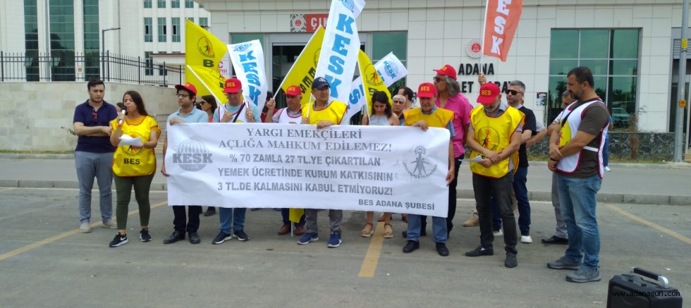 Büro Emekçileri Sendikası (BES) Adana Şubesi üyeleri Adana Adliyesi’nde personele verilen yemek parası ile ilgili açıklama yaptı. Adana Adliyesi önünde bir araya gelen BES üyeleri adına konuşan BES Şube Başkanı Fatma Güney Sarıoğuz, Adana Adliyesinde çalışan yargı emekçilerinin öğle yemeği ücreti yapılan yüzde 70’lik zamla birlikte 18,36 TL olan ücretin 27 TL' ye çıkarıldığını söyledi.