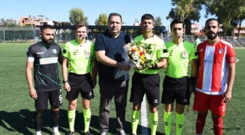 Adana ASKF Başkanı Ahmet Bozan, BAL'da mücadele eden Adaletgücü-Ceyhan 1967 FK maçı öncesi hakem ve her iki takım kaptanına çiçek vererek başarılar diledi.