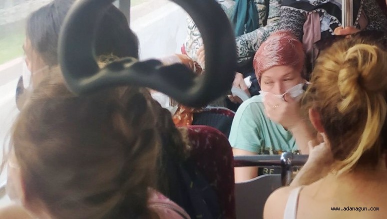 Adana’da otobüslerde balık istifi yolcu taşındı. Bu sırada bazı yolcuların maske takmalarına rağmen virüsten korktukları için elleri ile maskeyi ağız ve burunlarına sıkı sıkıya kapattıkları görüldü.