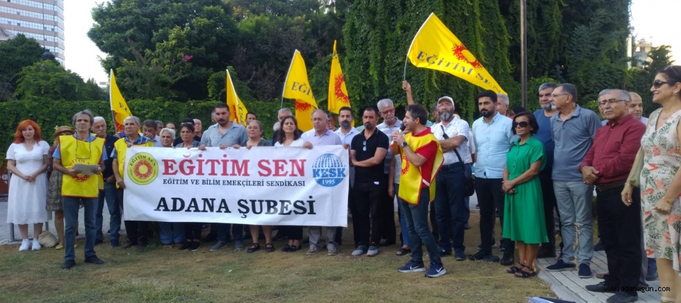 Adana Büyükşehir Belediyesi yanında bulunan Heykelli Park içerisinde bir araya gelen Eğitim Sen üyeleri adına basın açıklaması metnini Şube Başkanı Hüseyin Kaya okudu. Kaya, öğrenci velilerinin servis ve kayıt parası altında yüksek ücretlerle karşı karşıya olduğunu söyledi.