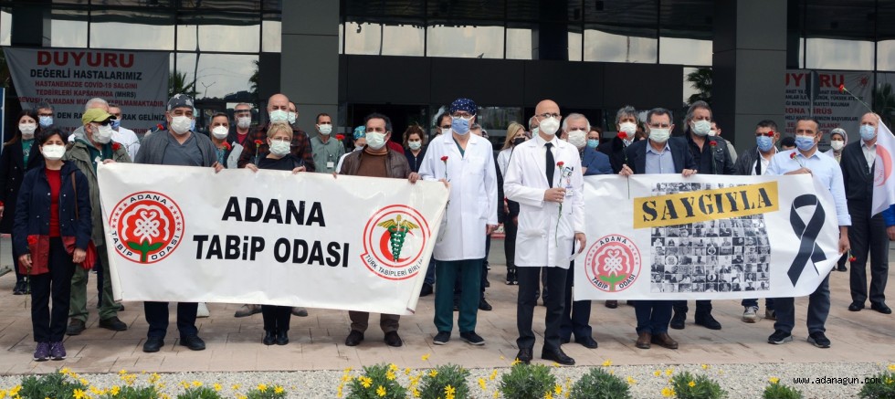 Adana Şehir Hastanesi Başhekimlik binası önünde bir araya gelen hekim ve sağlık çalışanları Kovid-19 salgını nedeniyle yitirilen hekim ve sağlık çalışanları için saygı duruşunda bulunup, fotoğraflarının bulunduğu afişe karanfiller bıraktılar.