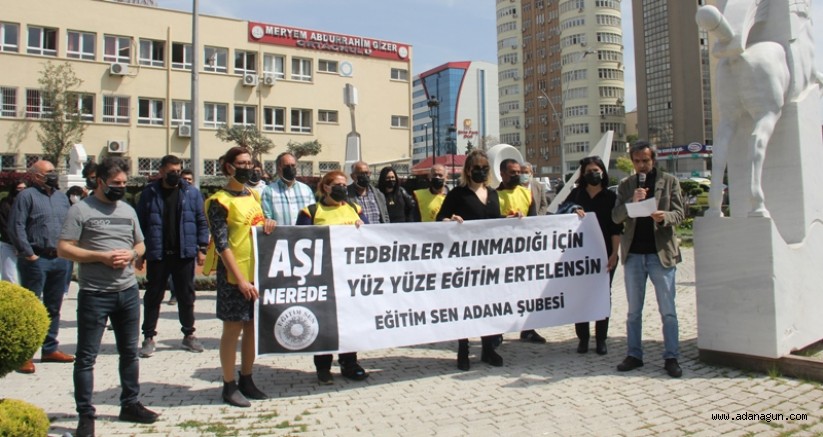 Eğitim ve Bilim Emekçileri Sendikası (Eğitim Sen) Adana Şubesi üyeleri, yaptıkları basın açıklaması ile artan vaka sayılarıyla yeniden büyüyen pandemi dolayısıyla yüz yüze eğitimde karşı karşıya bulunulan risklere dikkat çekip, taleplerini dile getirdi. Heykelli Park'ta yapılan açıklamaya çok sayıda eğitim emekçisi katıldı.